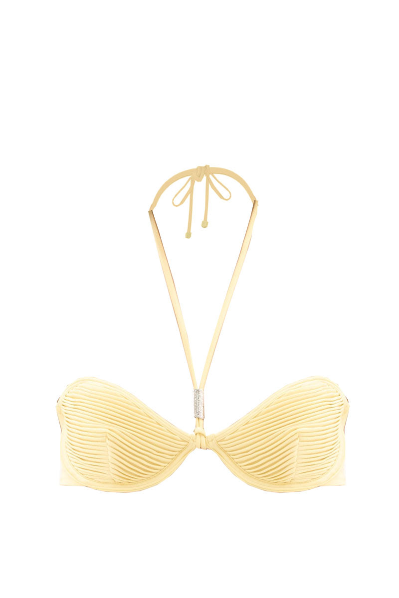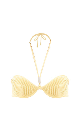 The Gal butter yellow bikini top is a crafted from shirring fabric for a luxurious drape. Embellished with a gold-tone metal jewel detail on the front. Coordinate effortlessly with the matching bikini bottom and mini skirt for seamless transitions from beach to boardwalk. Underwired and unpadded cups for excellent coverage, halter style and back self-tie closures.