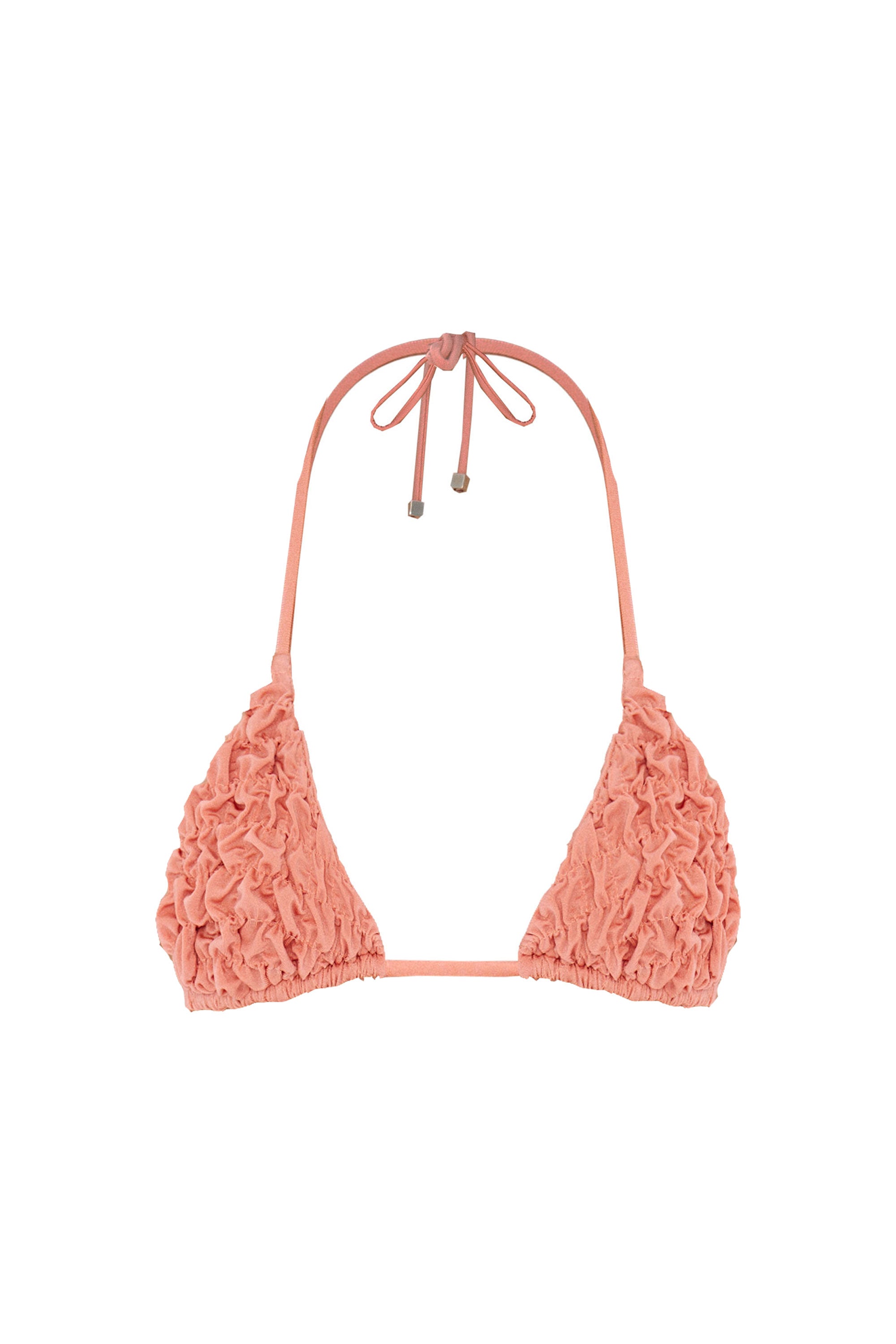 The Lia peach bikini top is a crafted from shirring fabric for a luxurious drape. Coordinate effortlessly with the matching bikini bottom and mini skirt for seamless transitions from beach to boardwalk. Unpadded cups for excellent coverage, halter style and back self-tie closures.