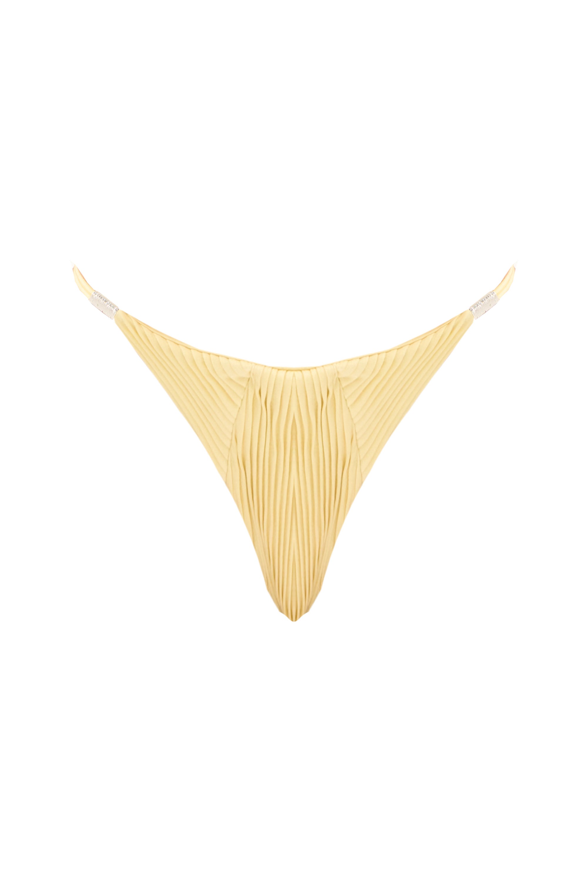 The Gal butter yellow bikini bottom is a cheeky brazilian bottom that highlights natural curves with moderate coverage. Side gold-tone metal jewel detail that enrich and capture light.