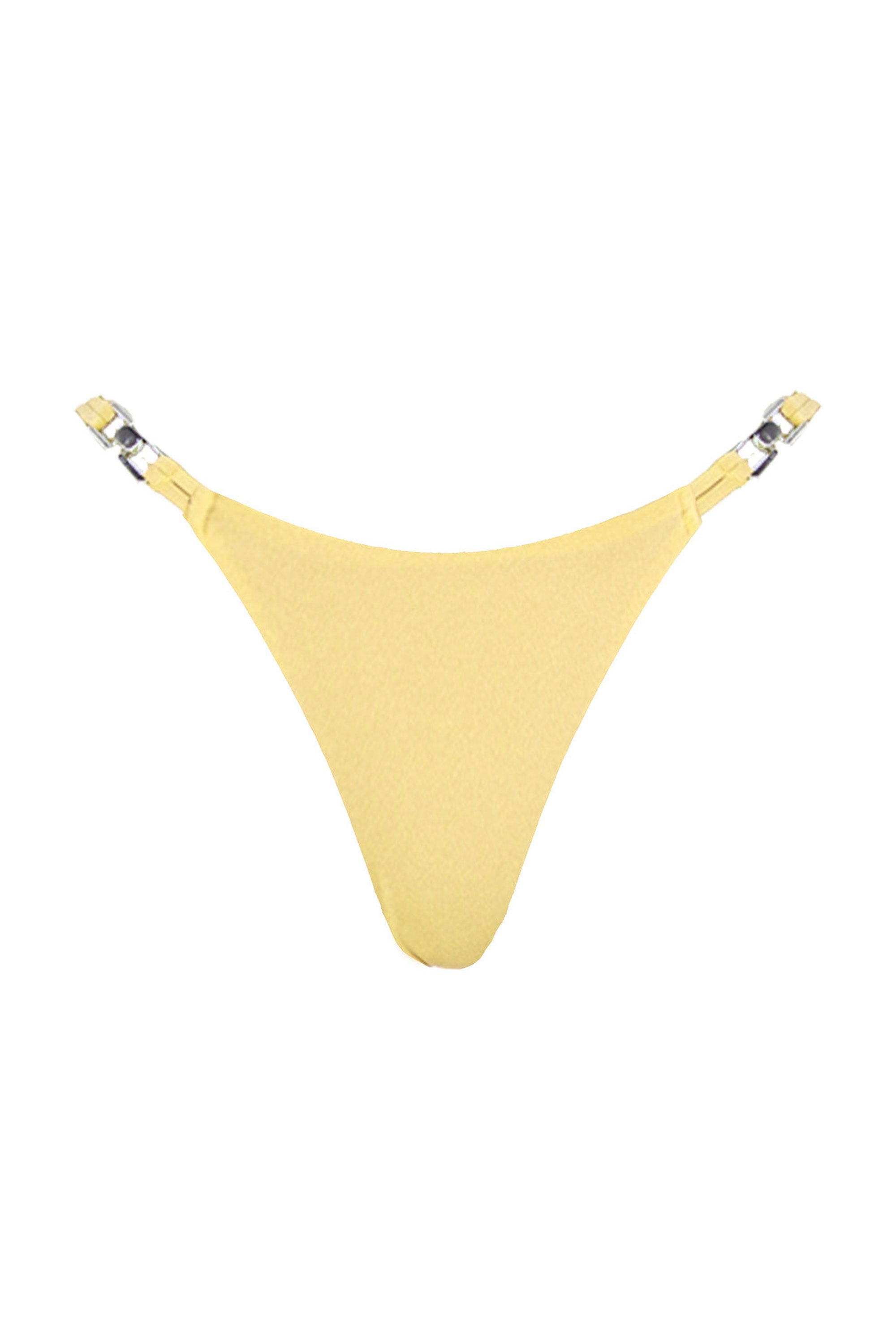 The Lia butter yellow bikini bottom is a cheeky brazilian bottom that highlights natural curves with moderate coverage. Side silver-tone accents that enrich and capture light. Coordinate effortlessly with the matching bikini top and mini skirt for seamless transitions from beach to boardwalk.